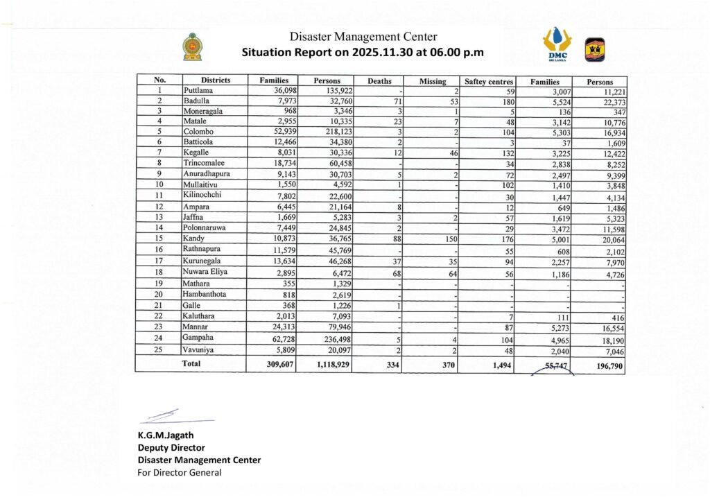 இலங்கையில் டித்வா புயலின் தாக்கத்தினால் உயிரிழந்தவர்களின் எண்ணிக்கை 334ஆக அதிகரித்துள்ளதாக அனர்த்த முகாமைத்துவ மத்திய நிலையம் தெரிவித்துள்ளது. இன்று மாலை 6 மணிக்கு வெளியிட்டுள்ள அறிக்கையில் இவ்வாறு தெரிவிக்கப்பட்டுள்ளது.